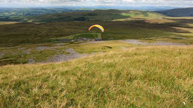 A short five minutes to take off on the shoulder and a 10mph wind meant I could take off low and soar up. The hope was the wind would do as forecast - start NNE and go NNW giving about 2hrs to play with. It did exactly that and allowed the full ridge to be flown. Thermals were few and short lived, the sun occasionally showed to brighten the day and the air was quite bouyant. It total I had three flights, a few top landings and managed almost 2 hrs flying before heading down to Hawes and coffee.