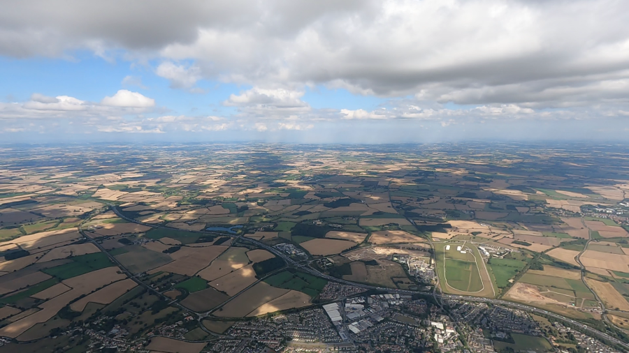 Heading towards Wetherby a rather strange cloud line appeared off to the east. It went right to the ground and initially I thought sea breeze haar. It turns out it was possibly smoke from a huge moor fire near Fylingdales. At this point it was just taking odd climbs and heading for our goal at Tadcaster. I arrived there just after Rob. The thought then became should we carry on? But .. a plan's a plan so I tuned back upwind to land, still at 2000'. Going back upwind was simply one long climb ... 3k later I was back over 3000'. It took some doing to find any sink to core down in, but eventually I touched down in a baking hot field.